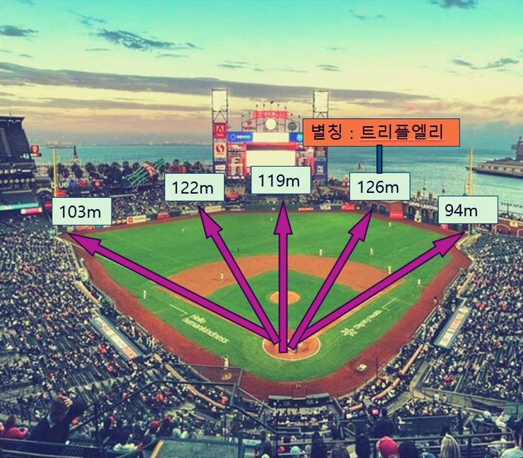 샌프란시스코 자이언츠의 오라클 파크는 생각보다 외야규모가 큰 편에 속합니다. 우리가 홈경기장을 보았을 때 유독 먼 거리의 외야가 있습니다. 그곳은 바로 Triple Alley (트리플 앨리) 입니다. 이곳은 무려 거리가 126미터나 되는데, 이 곳으로 장타를 날리는 경우 홈런은 잘 안나오고, 3루타가 많이 나오는 경우가 있습니다. 이정후 선수도 이쪽으로 안타를 쳐서 3루타를 기록한적이 있습니다. 하지만, 홈런을 치기란 어렵습니다.